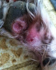 Winter weather can be hard on dog pads, from very cold snow hiding fragments of glass, to salt burn, to frostbite. Normally I don’t have too much problems, but this past week Cassie developed a nasty hole in her paw.